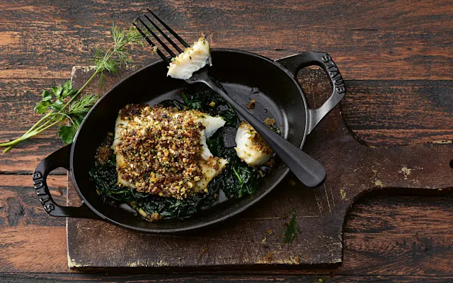 Seeteufel schwanz backofen gehen. Olivenöl in einer Form erhitzen. Seeteufel mit Kardamomkruste und Topinamburpüree.
